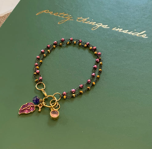 Double Strand 14Kt. Gold and Light Garnet Beads in Black Wire Wrapped chain with Ruby Colored Leaf Charm, Amethyst Swarovski Crystal and Pink Round Charms