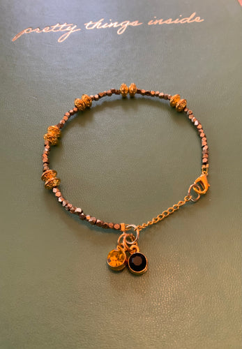 Semi-Precious Pyrite Silver Beaded Bracelet and Earring Set with Gold Filled Connector Beads and Onyx and Gold Crystal Charms